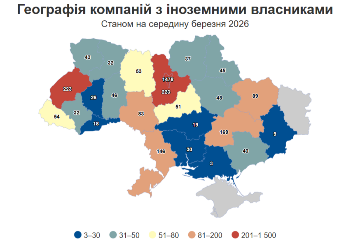 Майже 3 тисячі компаній з іноземними власниками, чий річний дохід перевищує 100 млн грн, працюють в Україні. З них 51 — на Черкащині. Згідно з даними «Опендатабот», найбільше таких компаній зареєстровано у Києві — 1478. Львівщина та Київщина мають по 223 бізнеси з іноземними власниками. Найменше таких компаній у Херсонській та Донецькій областях. Понад чверть компаній іноземців працюють в оптовій торгівлі — 774, ще 268 — у сільському господарстві та 176 — в ІТ-секторі.